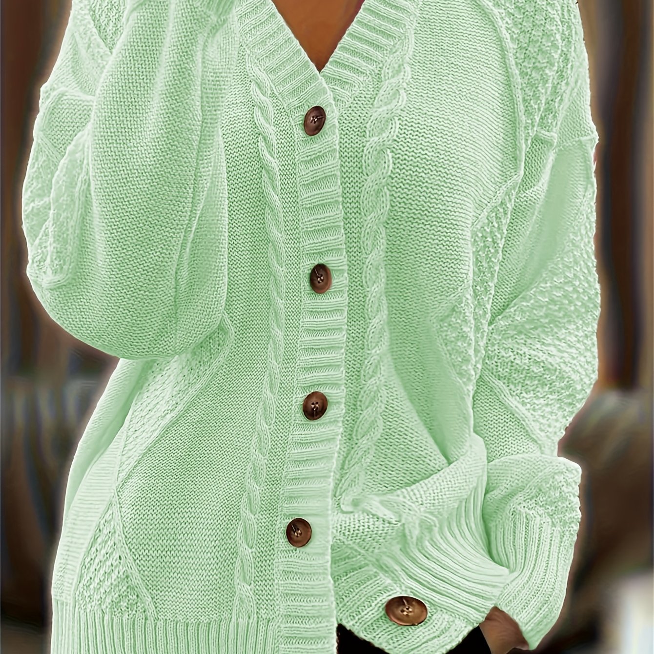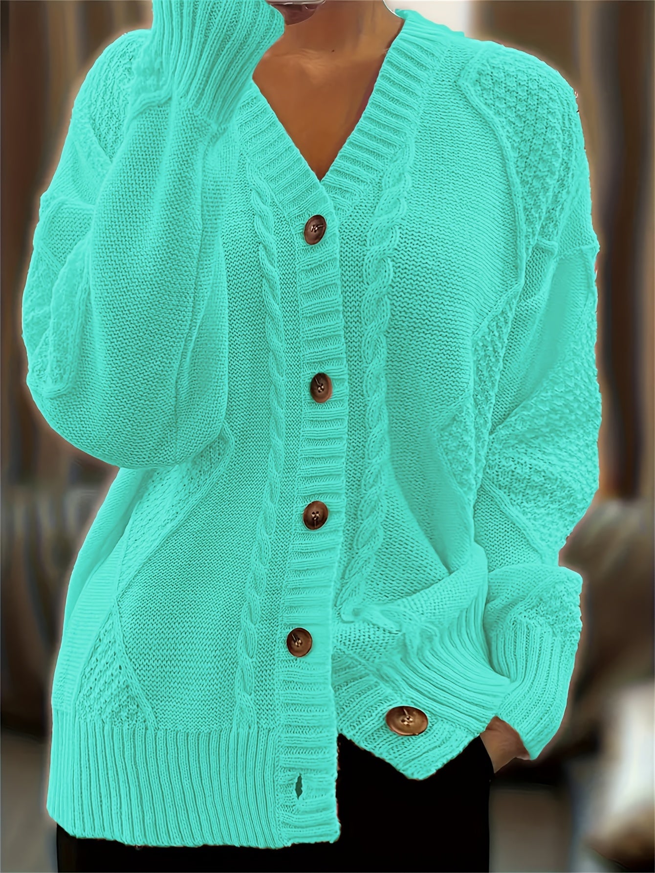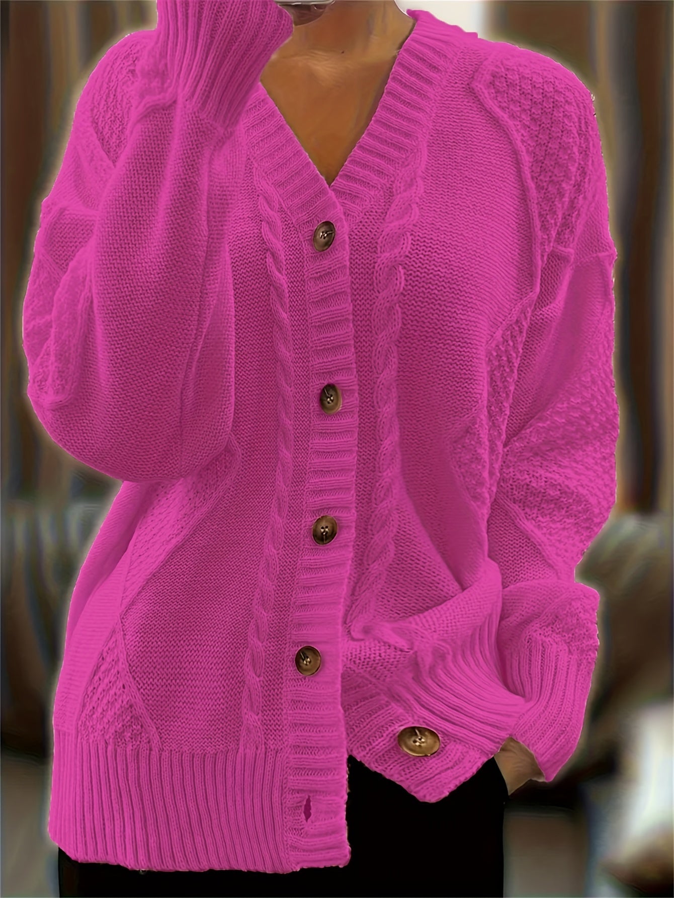 This cable-knit cardigan redefines cozy sophistication with its relaxed fit and textured details. Featuring large buttons and a soft drape, it’s the perfect blend of warmth and timeless style. Ideal for layering over tees or blouses, it adds effortless polish to your casual or workday looks.