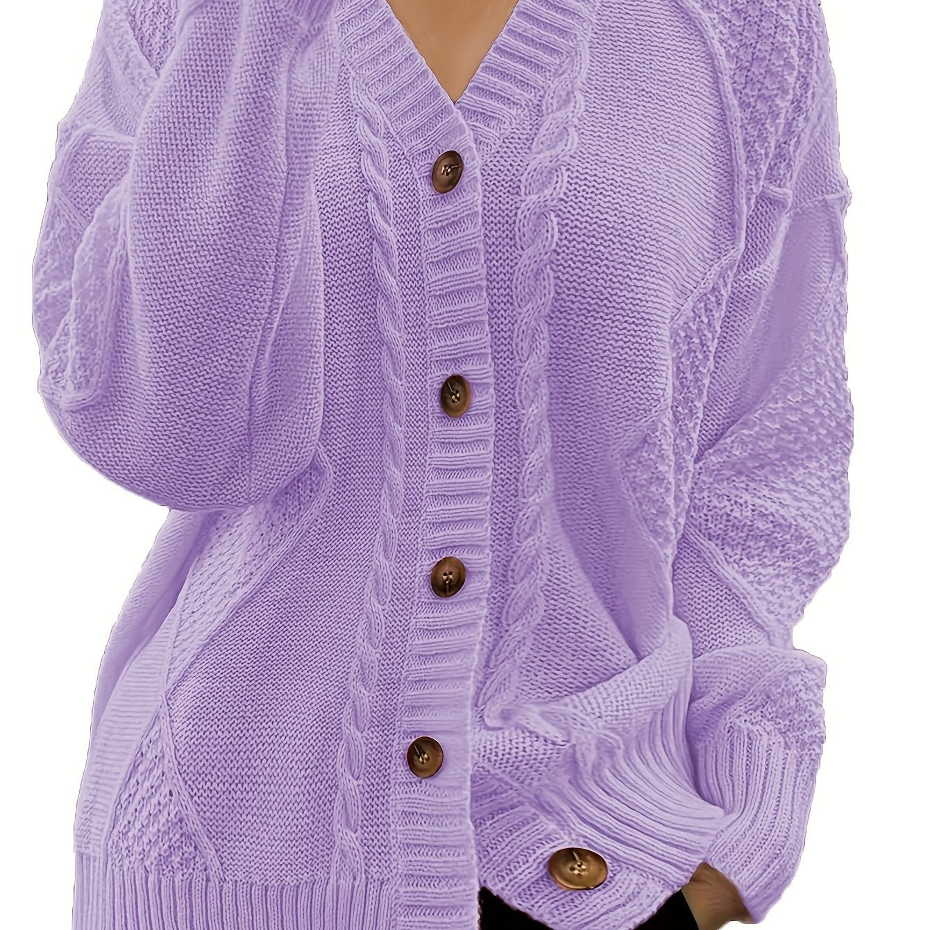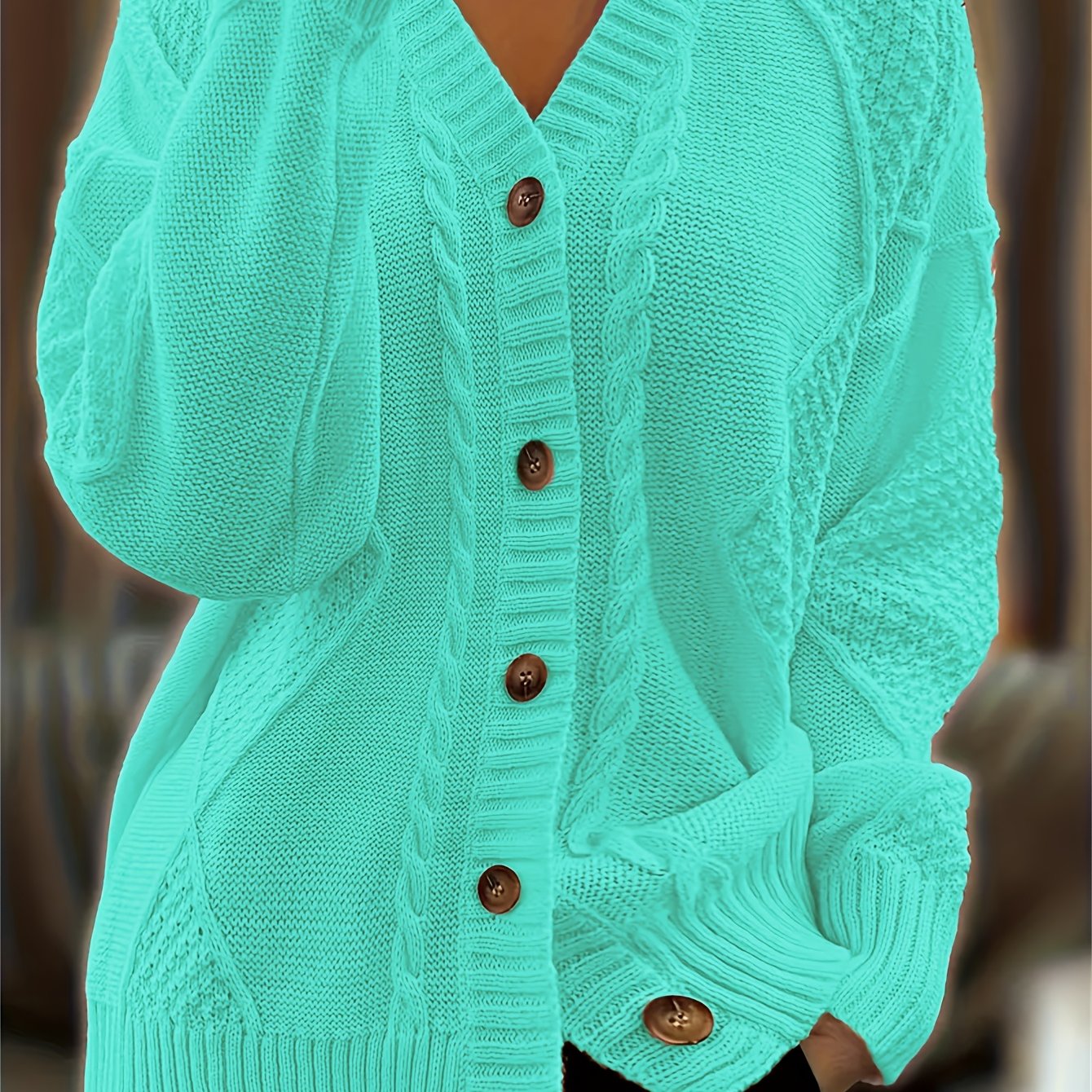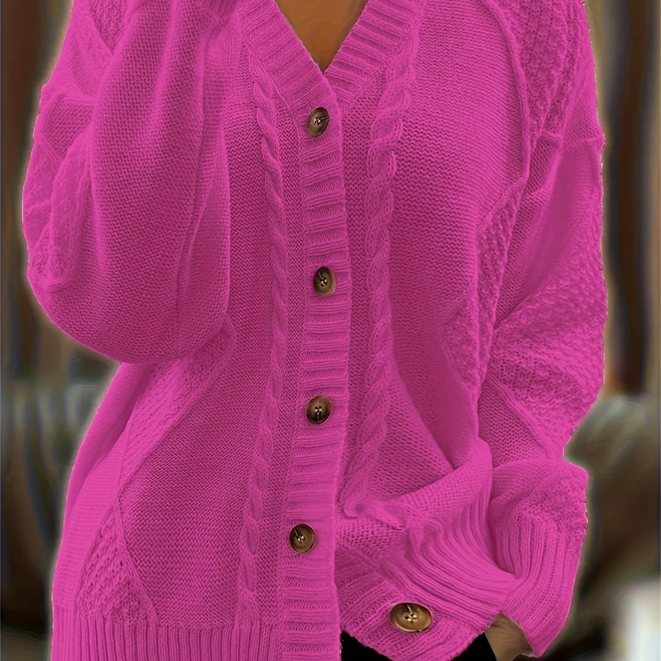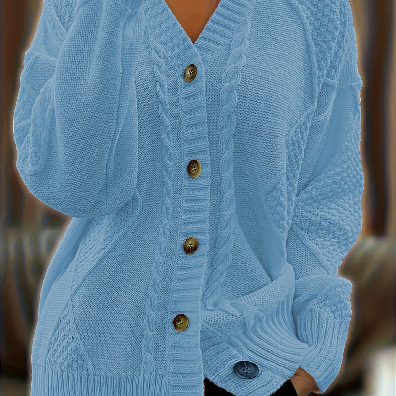 This cable-knit cardigan redefines cozy sophistication with its relaxed fit and textured details. Featuring large buttons and a soft drape, it’s the perfect blend of warmth and timeless style. Ideal for layering over tees or blouses, it adds effortless polish to your casual or workday looks.