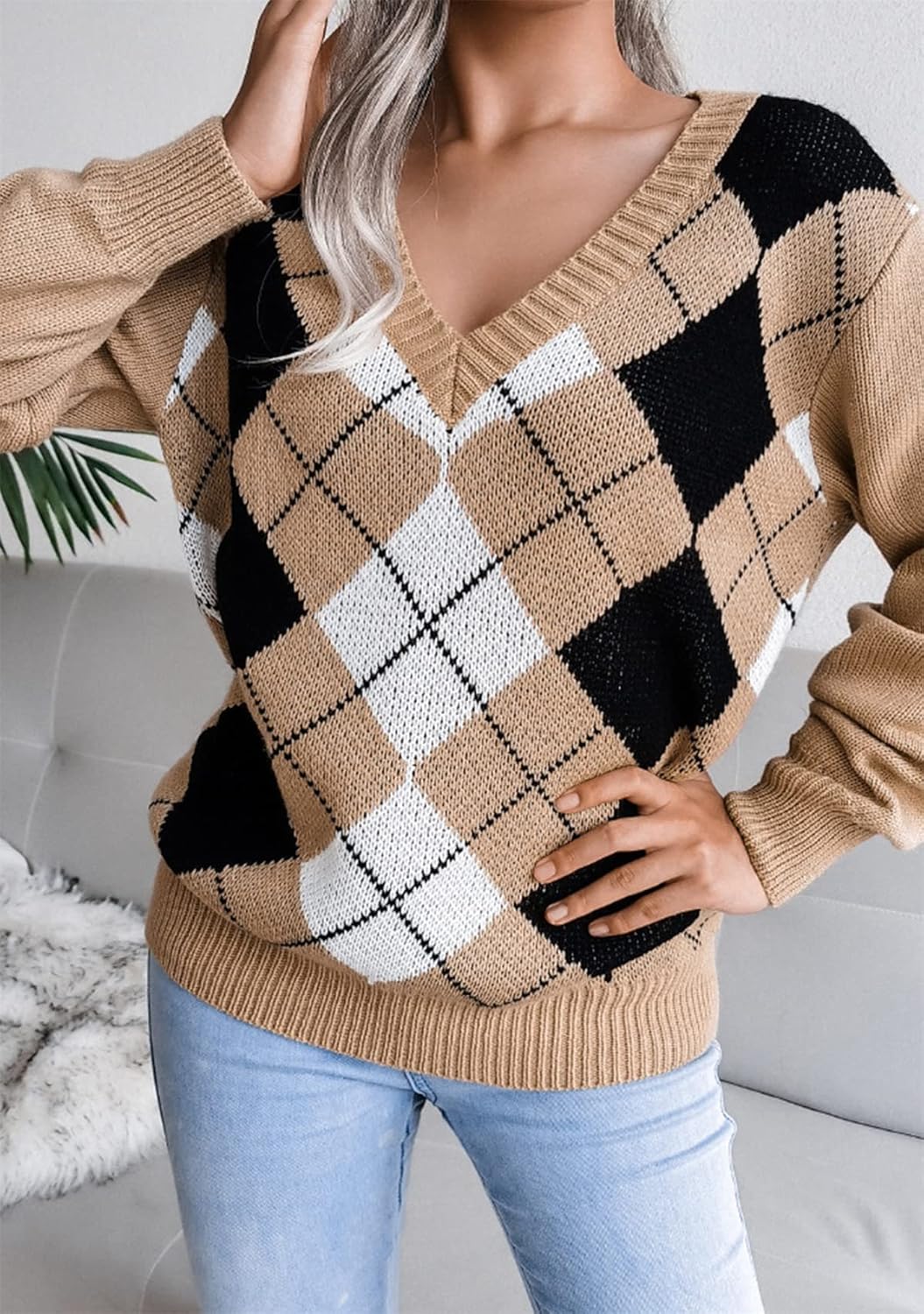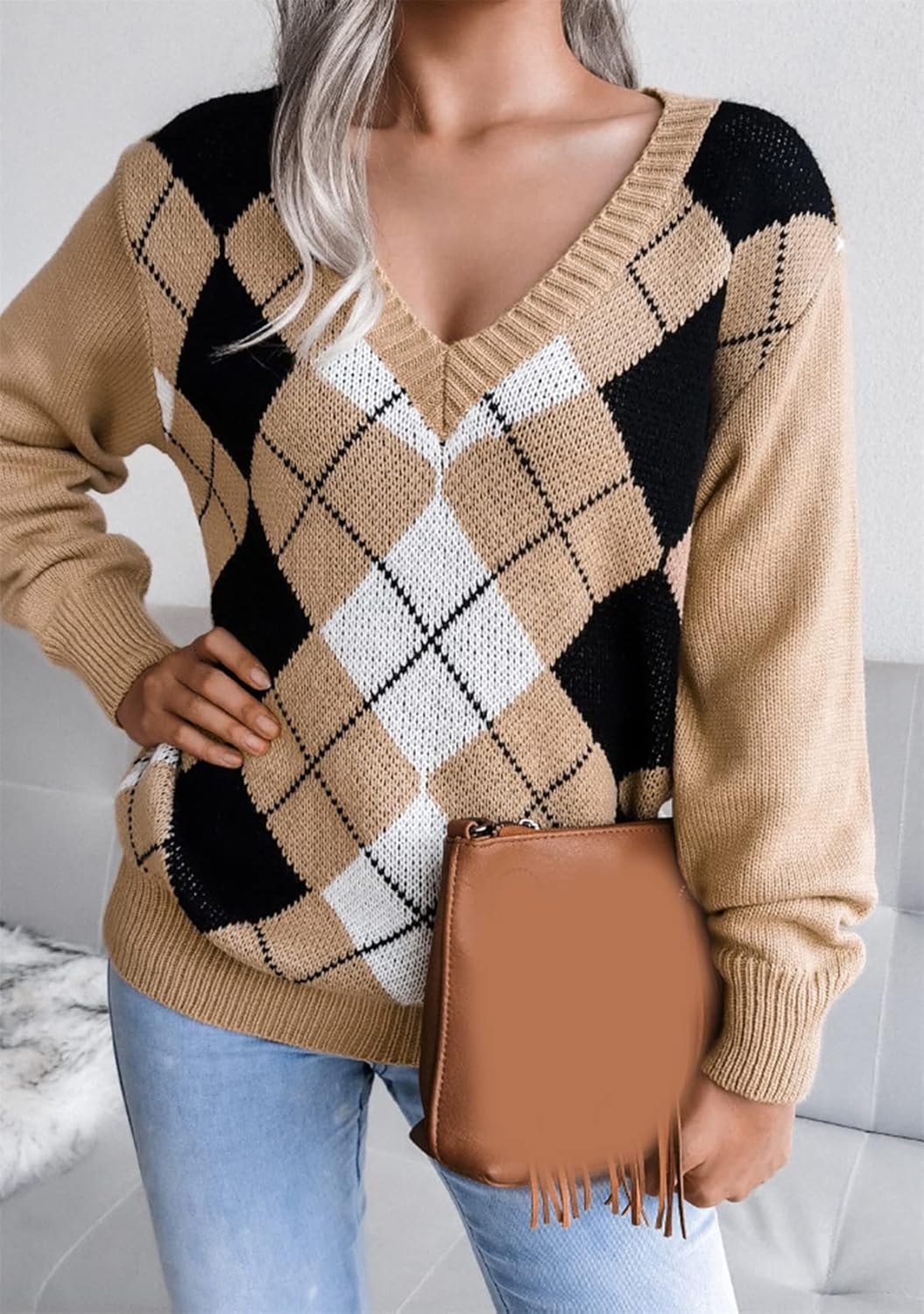 This argyle V-neck sweater blends classic preppy charm with a modern edge. The warm camel, black, and white pattern creates a bold yet versatile look that elevates your casual style. Perfect for layering or wearing solo, it’s an instant statement piece for effortless sophistication.